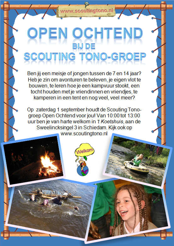 Altijd al avonturen willen beleven? Op 1 september 2012 is bij uitstek je mogelijkheid om een kennis te komen maken met de Scouting Tono-groep. De hele ochtend houdt de Scoutinggroep een open ochtend voor meisjes en jongens tussen de 7 en 14 jaar oud. Je bent van harte welkom van 10:00 uur tot 13:00 uur.