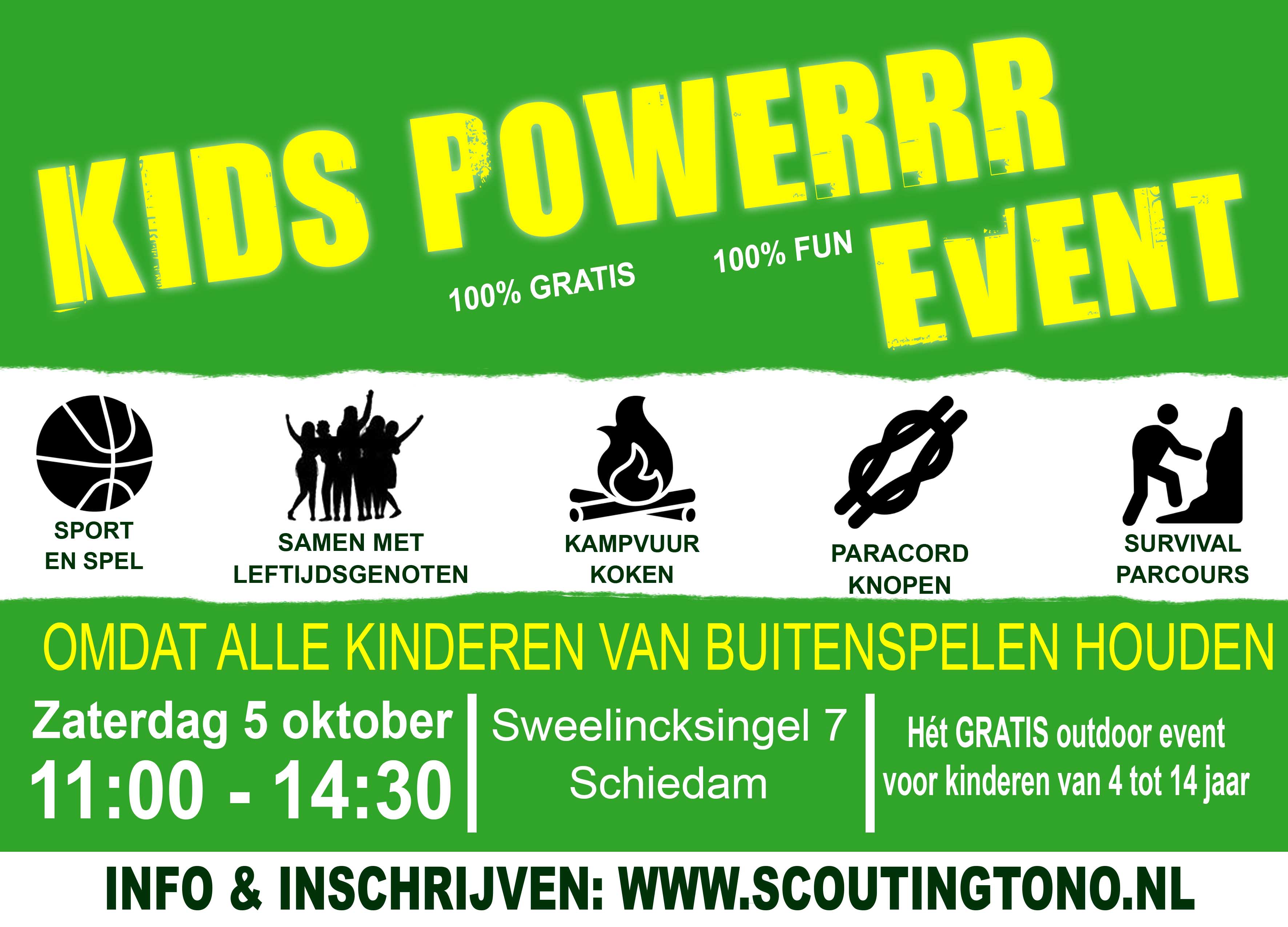 Voor meisjes en jongens uit Schiedam en omgeving wordt een tof evenement georganiseerd: het Kids Powerrr Event! Wat ze hier allemaal kunnen doen? Een survival parcours afleggen bijvoorbeeld. Of paracord knopen. Via een apenbrug oversteken. Dat zijn twee touwen die boven elkaar hangen. Een om op te lopen, en een om je aan vast te houden. En dan niet er af vallen natuurlijk. Of samen met anderen een toneelstukje doen. Je eigen eten klaar maken boven een kampvuur. Helemaal gratis en mogelijk gemaakt door de vrijwilligers van de Scouting Tono-groep.