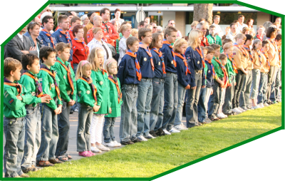 speltak op zijn of haar scoutingkleding gespeld en legt het de belofte af. Ook