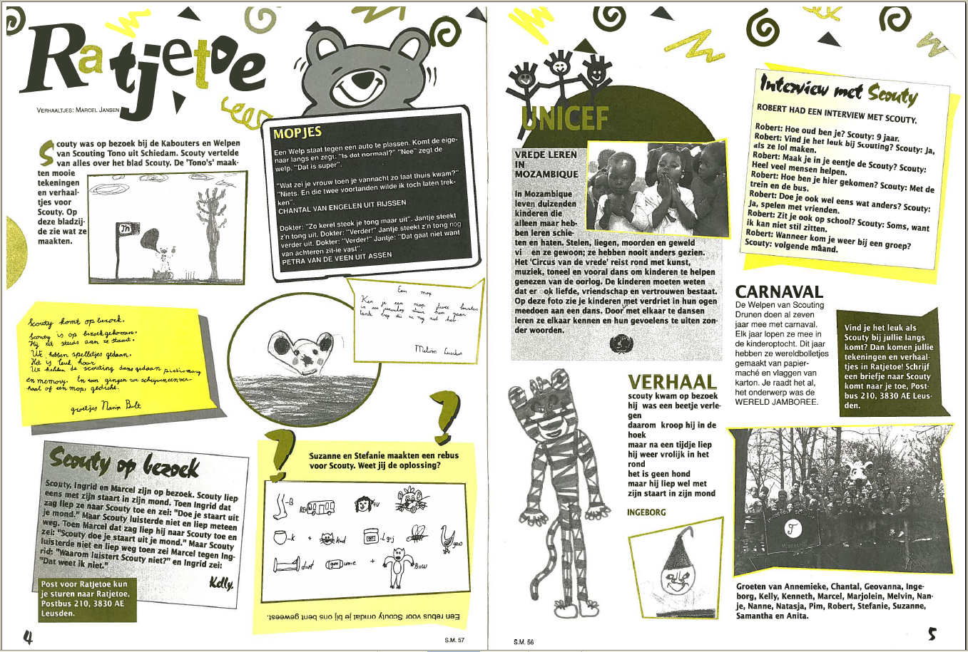 De pagina's 4 en 5 van de Scouty die door de Kabouters en Welpen van de Glimwormpjeskring is gemaakt. De artikelen zijn van de hand van de kinderen. Klik op de afbeelding voor een grotere versie.