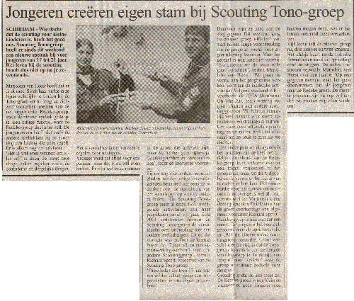Daarvoor zijn ze hard aan de slag gegaan. dit weekend ging de nieuwe groep officieel van start na een lange voorbereiding die de jongeren vooral voor eigen rekening namen. Maar het geregel is nog lang niet voorbij. 'Nu moeten we de stam echt gaan oprichten', vertelt Marjolein van Heest. 'We gaan nu vooral aan het programma werken, eerst aan de landelijke activiteiten. volgende weekend is bijvoorbeeldde JOTA (Jamboree On The Air, Red) waarbij we gaan chatten met andere Scoutinggroepen. we hebben natuurlijk veel plannen voor stoere activiteiten. We draaiden al vijf weken voor deze officiele oprichting en tot nu toe blijkt het allemaal net zo leuk te zijn als we dachten.