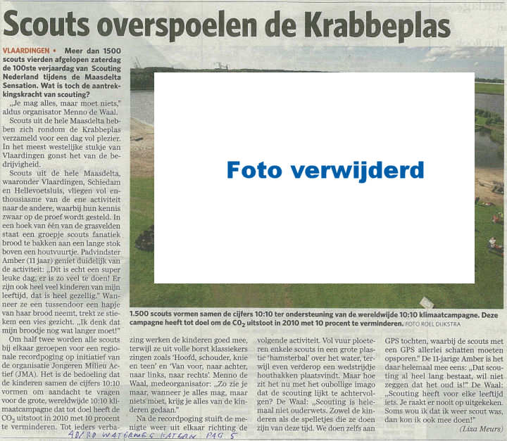 Honderd jaar Scouting in Nederland. Op verschillende plaatsen vieren Scouts feest. Zo ook de regio Scouting Maasdelta die een groot feest voor alle jeugdleden in de regio organiseert op 18 september 2010 aan de Krabbeplas in Vlaardingen. Ook het Algemeen Dagblad/Rotterdams Dagblad plaatst een bericht hierover in haar Waterweg katern.