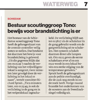 Op 18 mei 2017 brandde het gebouw van de Scouting Tono-groep af. In de maanden er voor was er hard gewerkt aan een domotica-systeem waarmee automatisch het licht uitgeschakeld kon worden, om zo milieuvriendelijker bezig te zijn. Na de brand is de geheugenkaart van de centrale controller veiliggesteld.