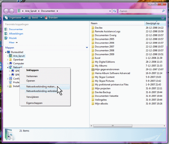 Zoek in het lijstje aan de linkerkant 'Netwerk' en gebruik hier je rechtermuisknop. In het menu dat nu wordt getoond, kies voor 'Netwerkverbinding maken'.