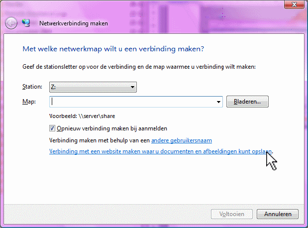 Onderin hetzelfde scherm staat een link met de tekst "verbinding met een website maken waar u documenten en afbeeldingen kunt opslaan". Klik op deze link.