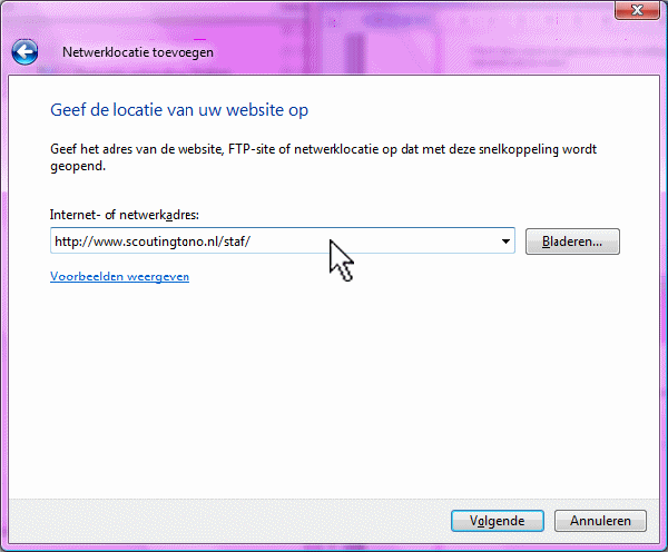 Vul nu het adres van de server in: "http://www.scoutingtono.nl/staf/". Eventueel kan je ook direct
