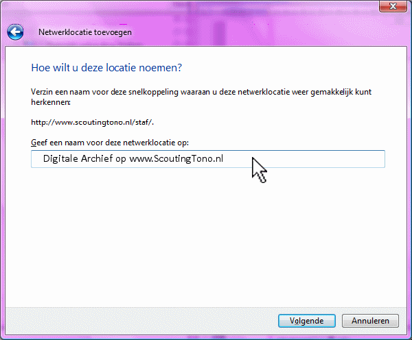 Als laatste stap vraagt de wizzard om een naam op te geven voor de verbinding. Het handigste is om als naam 'Digitale Archief op www.ScoutingTono.nl' in te vullen. Dan weet je altijd om welke verbinding het hier gaat.
