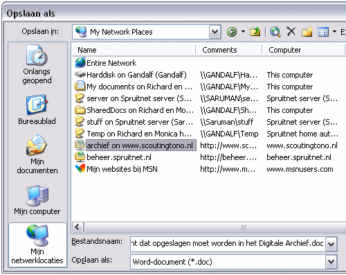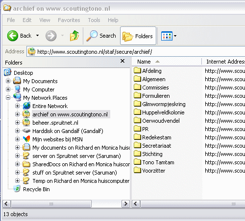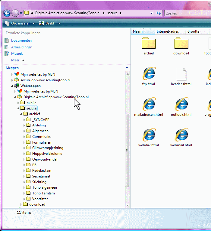 Vanaf nu zal er in de Verkenner een item 'Webmappen' staan, met hieronder de toegang tot het 'Digitale Archief van de Scouting Tono-groep'.