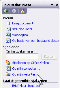 Klik onder 'Sjablonen' op 'Op mijn websites...'. Een van de getoonde opties zal 'Digitale Archief op www.ScoutingTono.nl' zijn. Na het invoeren van je gebruikersnaam en wachtwoord kan je onder 'Secure/Archief/Formulieren' en dan 'Briefpapier' alle vormen van briefpapier vinden in de meest recente uitvoering1. Klik op een van de bestanden om een nieuwe brief te maken.